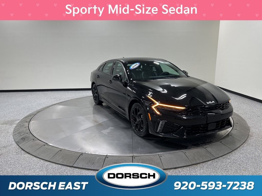 4-Wheel Disc Brakes, 6 Speakers, ABS brakes, Active Sound Design, Air Conditioning, AM/FM radio: SiriusXM, Apple CarPlay & Android Auto, Auto High-beam Headlights, Auto-Dimming Mirror with HomeLink, Automatic temperature control, Bose Premium Audio, Brake assist, Bumpers: body-color, Carpeted Floor Mats, Custom Wheels, Delay-off headlights, Driver door bin, Driver vanity mirror, Dual front impact airbags, Dual front side impact airbags, Electronic Stability Control, Emergency communication system: Kia Connect (includes 1 year free trial), Four wheel independent suspension, Front anti-roll bar, Front Bucket Seats, Front Center Armrest, Front dual zone A/C, Front fog lights, Front reading lights, Fully automatic headlights, GT-Line Premium Package, Heated door mirrors, Heated Front Bucket Seats, Heated front seats, Heated steering wheel, Illuminated entry, Knee airbag, Leather Shift Knob, Leather steering wheel, LED Interior Lighting, LED Trunk Light, Low tire pressure warning, Navigation System, Occupant sensing airbag, Outside temperature display, Overhead airbag, Overhead console, Panic alarm, Panoramic Sunroof, Passenger door bin, Passenger vanity mirror, Power door mirrors, Power driver seat, Power steering, Power windows, Radio data system, Radio: AM/FM Audio System, Rear anti-roll bar, Rear seat center armrest, Rear side impact airbag, Rear window defroster, Remote keyless entry, Security system, Speed control, Speed-sensing steering, Split folding rear seat, Sport steering wheel, Steering wheel mounted audio controls, Tachometer, Telescoping steering wheel, Tilt steering wheel, Traction control, Trip computer, Turn signal indicator mirrors, Variably intermittent wipers, Wheels: 18 x 7.5J Gloss Black Machined Finish Alloy, Wheels: 18 x 7.5J Unique Gloss Black Alloy. New Price! 24/33 City/Highway MPG 2026 Kia K5 GT-Line