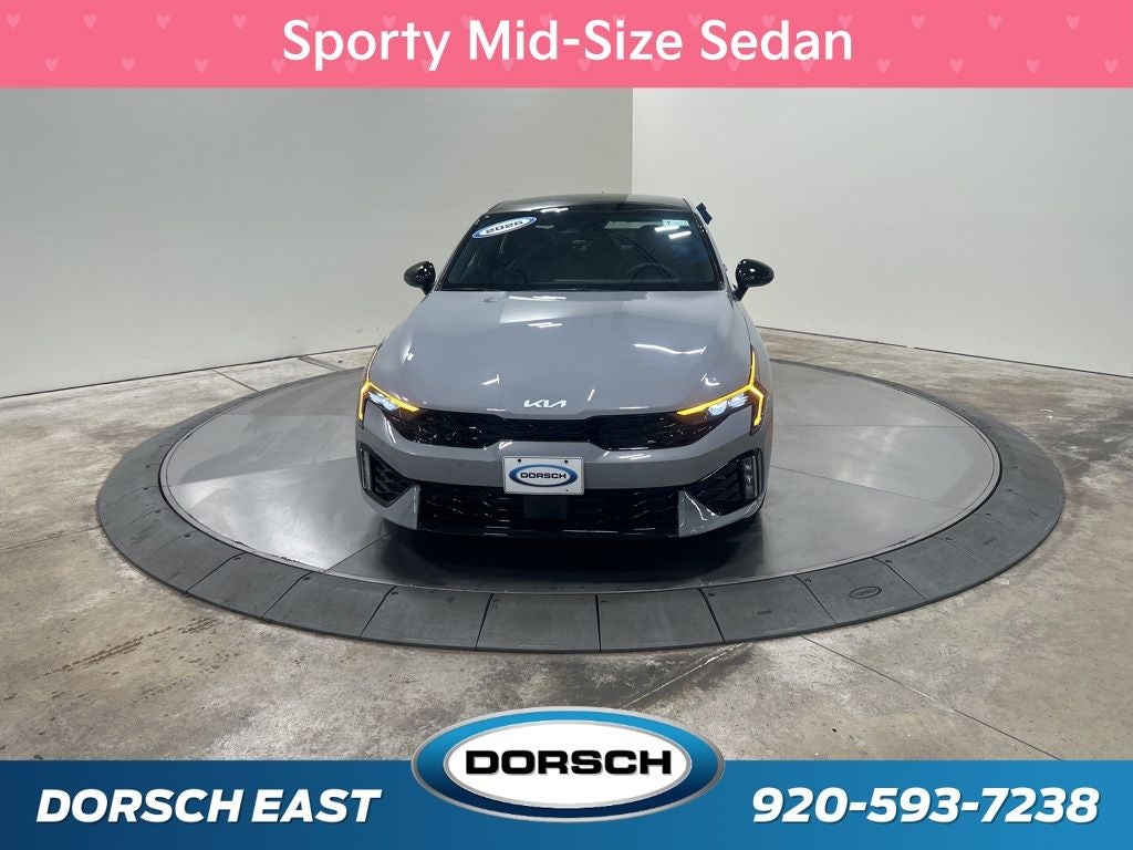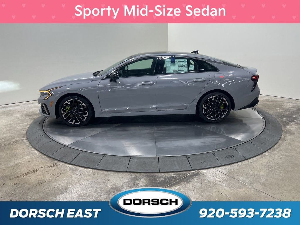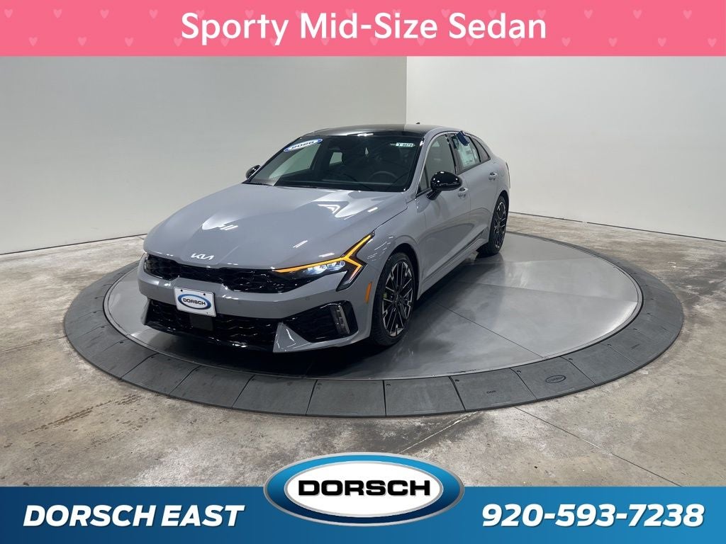 4-Wheel Disc Brakes, 6 Speakers, ABS brakes, Air Conditioning, AM/FM radio: SiriusXM, Auto High-beam Headlights, Automatic temperature control, Brake assist, Bumpers: body-color, Cargo Net, Custom Wheels, Delay-off headlights, Driver door bin, Driver vanity mirror, Dual front impact airbags, Dual front side impact airbags, Electronic Stability Control, Emergency communication system: Kia Connect (includes 1 year free trial), Four wheel independent suspension, Front anti-roll bar, Front Bucket Seats, Front Center Armrest, Front dual zone A/C, Front fog lights, Front reading lights, Fully automatic headlights, Heated door mirrors, Heated front seats, Heated Sport Bucket Seats, Illuminated entry, Knee airbag, Leather Shift Knob, Leather steering wheel, Low tire pressure warning, Navigation System, Occupant sensing airbag, Outside temperature display, Overhead airbag, Overhead console, Panic alarm, Passenger door bin, Passenger vanity mirror, Power door mirrors, Power driver seat, Power moonroof, Power steering, Power windows, Radio data system, Radio: AM/FM Audio System, Rear anti-roll bar, Rear reading lights, Rear seat center armrest, Rear side impact airbag, Rear window defroster, Remote keyless entry, Security system, Speed control, Speed-sensing steering, Split folding rear seat, Sport steering wheel, Steering wheel mounted audio controls, SynTex Seat Trim, Tachometer, Telescoping steering wheel, Tilt steering wheel, Traction control, Trip computer, Turn signal indicator mirrors, Variably intermittent wipers, Wheels: 19 x 8.0J Gloss Black Machined Finish Alloy. 23/33 City/Highway MPG 2026 Kia K5 GT